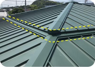 「谷」とは二つの屋根面が交わる所で、大量の雨水が集まり流れることで、雨漏りがおこりやすい部分です。