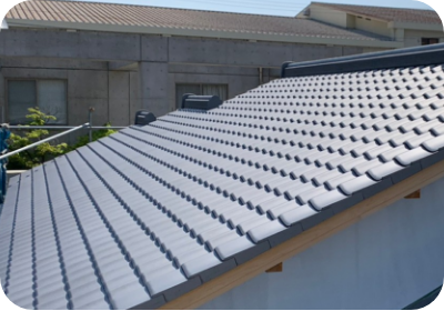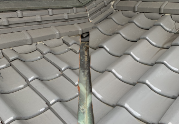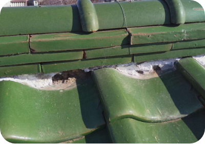 面戸漆喰とは、棟等の台土を覆い隠すように塗られる漆喰のことです。この面戸漆喰が劣化すると、横殴りの雨が降った時に、棟の瓦の土が流され棟の瓦の落下につながる可能性があります。