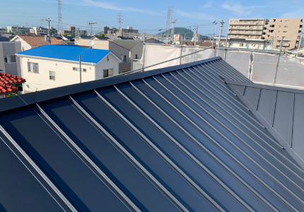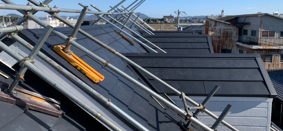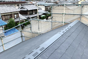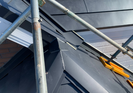 新しい屋根材を取り付けた後に、棟板金を設置します。その後、屋根の施行が全て終わったら再度問題がないか確認し、清掃します。その後、足場を解体して工事完了です。