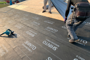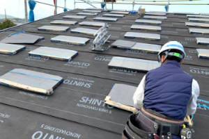 棟板金・雪止めを撤去した後は、ルーフィングを貼り付けていきます。ルーフィングを貼り替えられるのは新築着工時か屋根リフォームの時だけなので、必ず必要になる工程です。